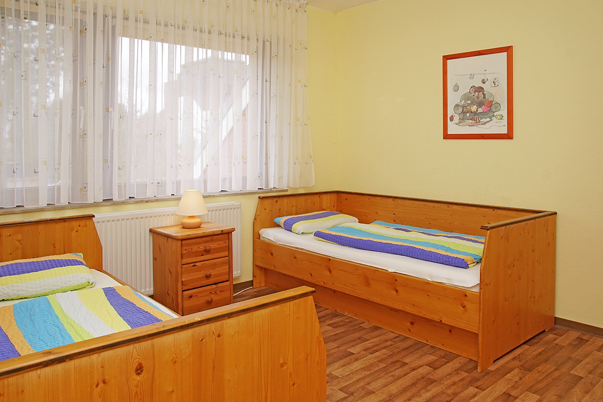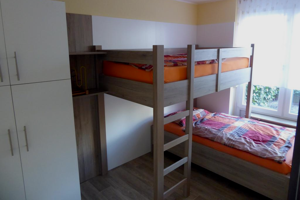 Im Kinderzimmer befindet sich ein Etagenbett, einigen Spielsachen und Kinderbücher. Auf dem Wickeltisch können die