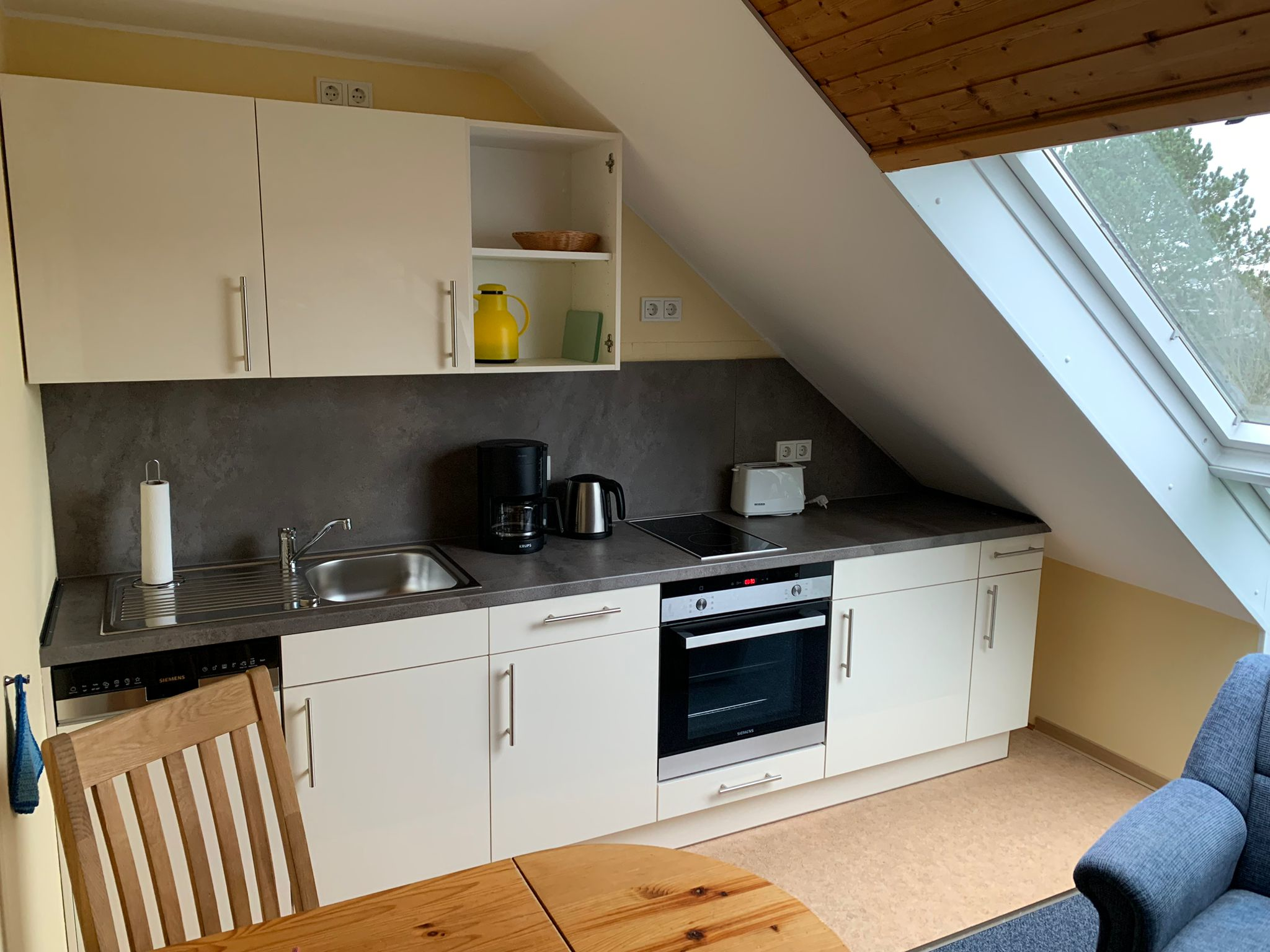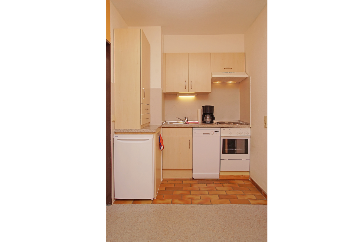 In der großen, voll eingerichteten Küche (u. A. mit Mikrowelle und Geschirrspüler) finden bequem 4-5 Personen Platz.