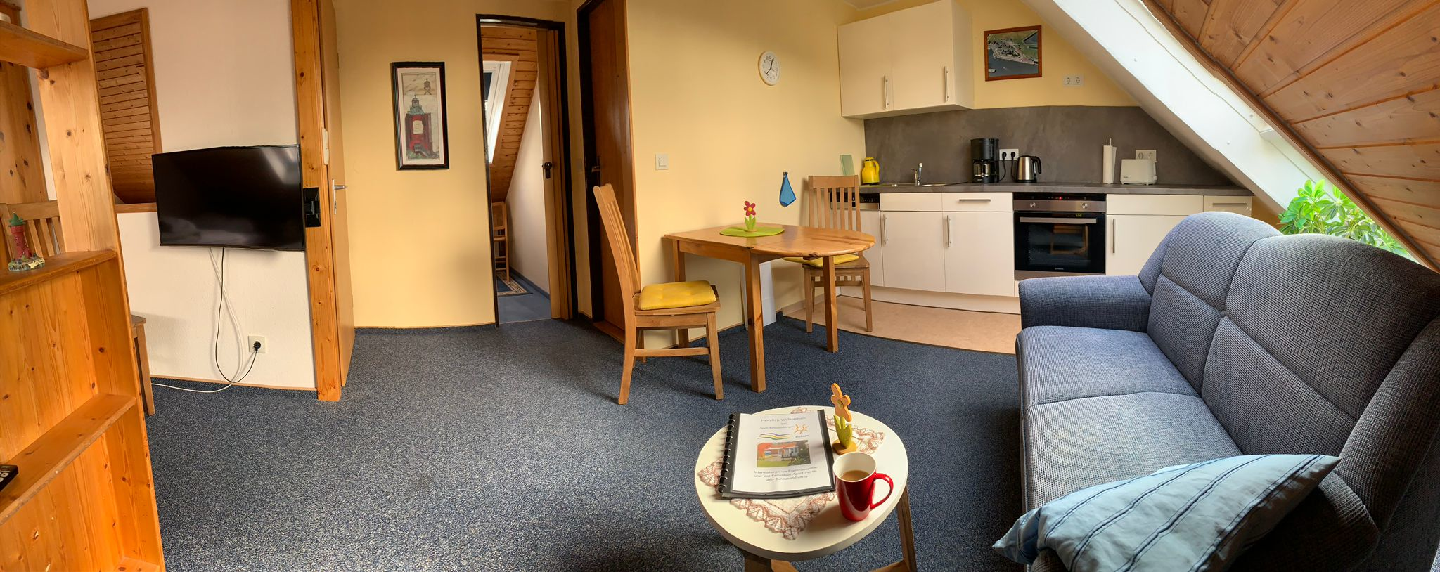 Der Wohn-/ Essbereich mit Küchenzeile ist durch einen Raumteiler vom Schlafbereich abgetrennt. In einem weiteren Raum befindet sich ein 3. Bett.